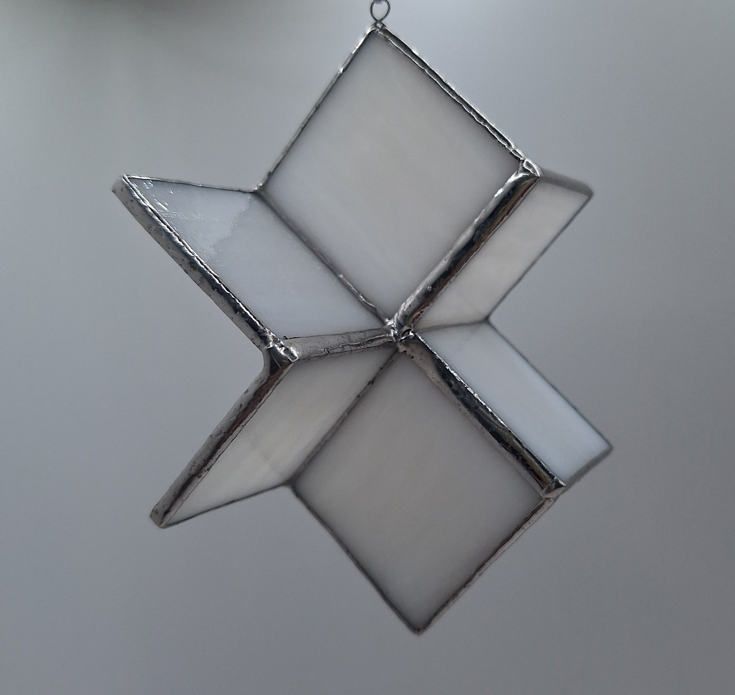 Etoile géométrique en verre blanc opalescent . Réalisée à la main selon la technique Tiffany Inspirée de la pureté hivernale.