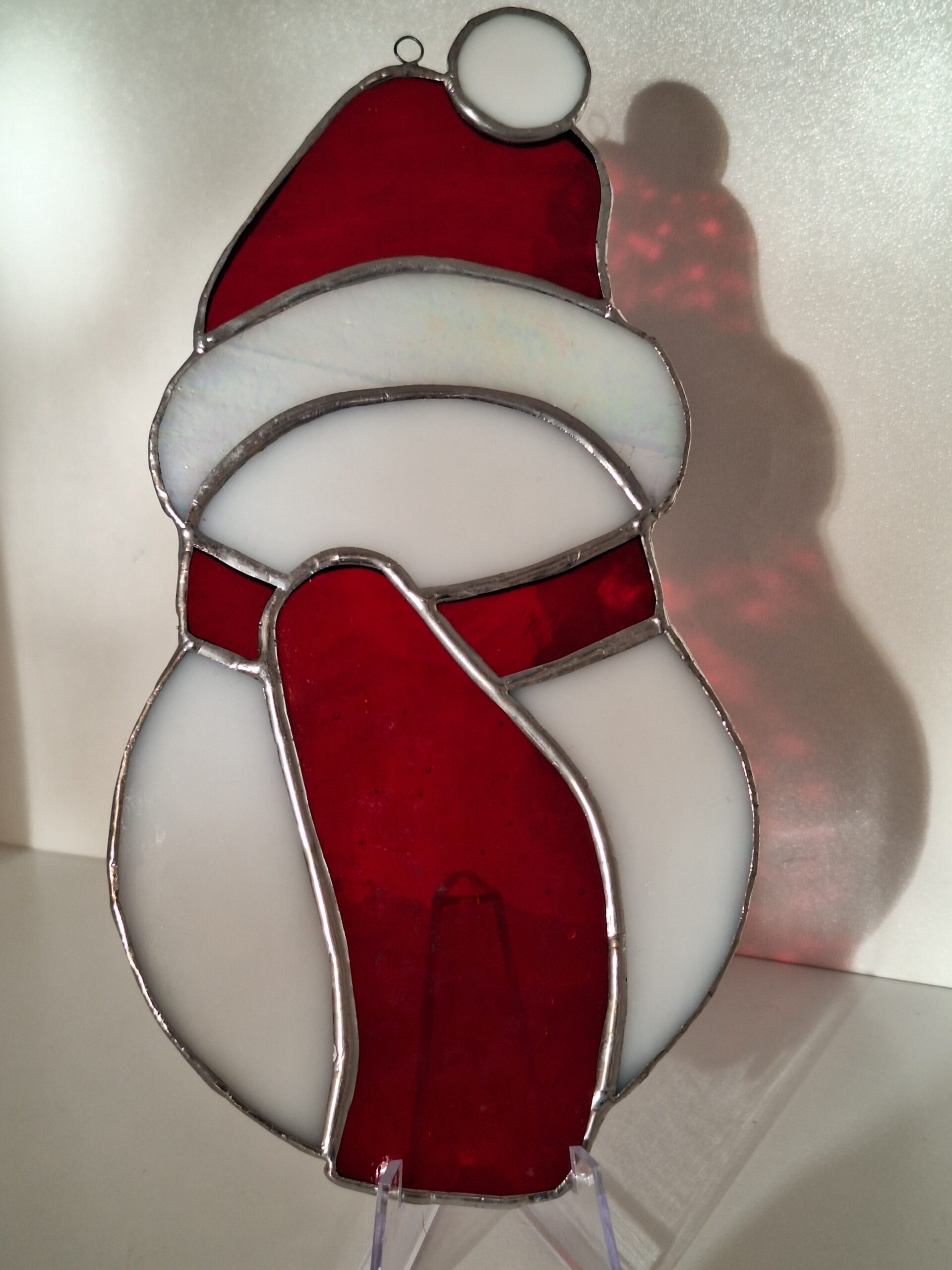 Ce bonhomme de neige est caractérisé par un chapeau et une écharpe rouge vif Le blanc opalescent est légèrement irisé, il contraste bien avec le rouge La méthode d’assemblage reste traditionnelle