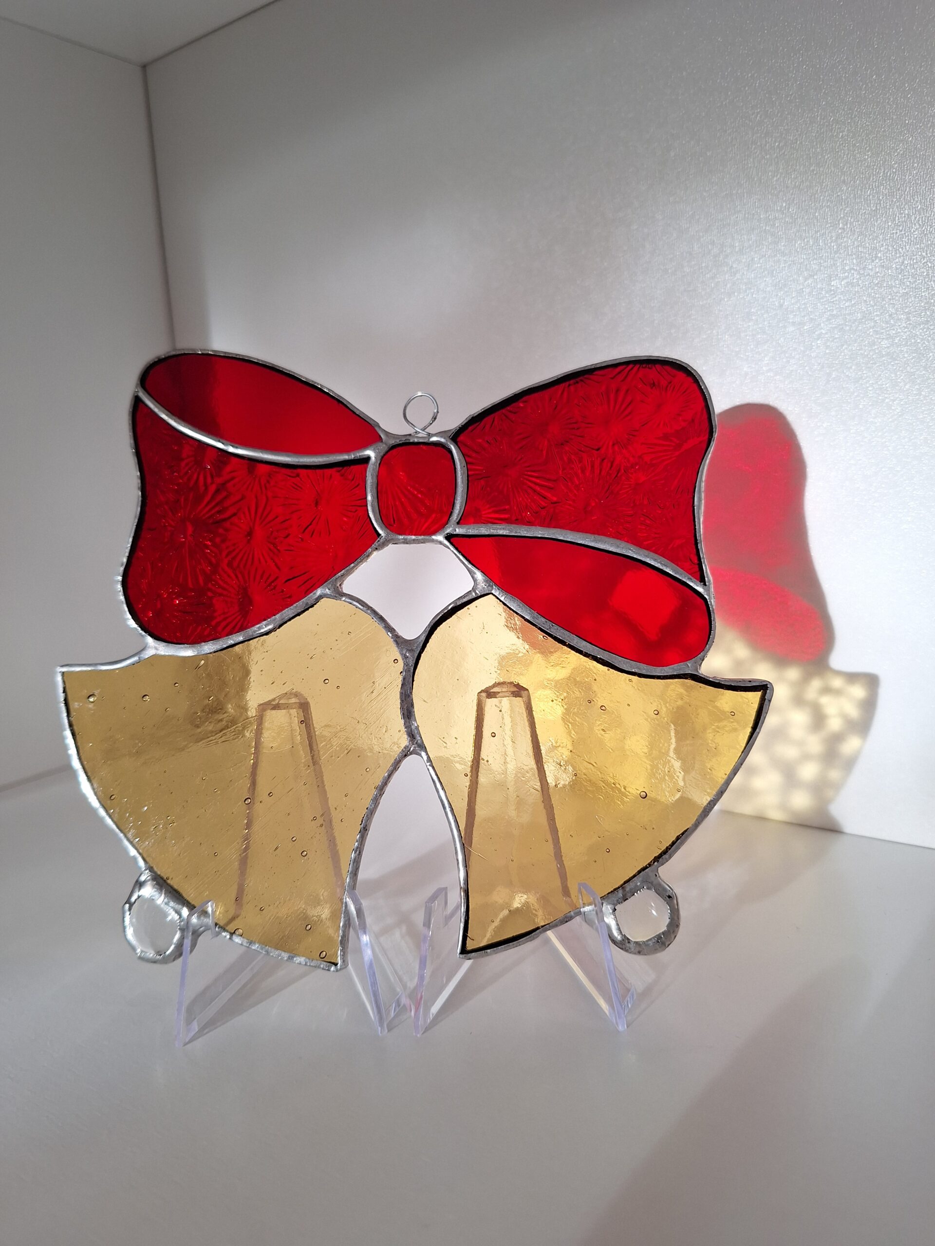 Les cloches sont coupées dans un verre ambré lumineux Le ruban est réalisé avec deux type de verre différent, pressé et moulé L’assemblage est fait selon la méthode Tiffany. Cet ornement est conçu pour capter la lumière et projeter des couleurs chaudes et festives