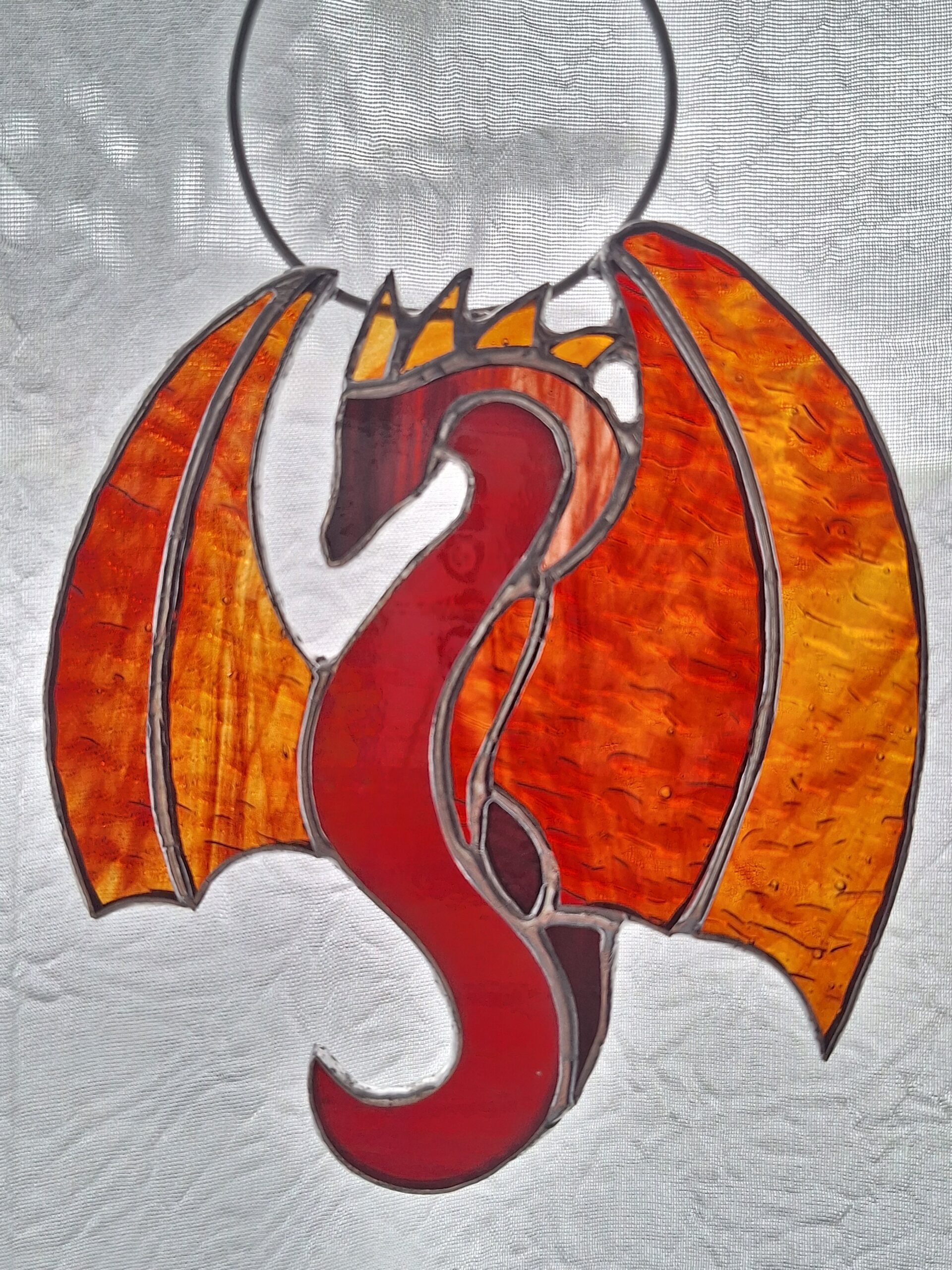 Vitrail artisanal représentant un dragon aux ailes déployées, symbole de puissance et de protection. Mélange de verre texturé rouge/orange et de verre opalescent. Il capte la lumière et créé des reflets chaleureux et intenses Caractéristiques: Longueur totale  15,5 cm Longueur dragon 11,5 cm Largeur 10,5 cm