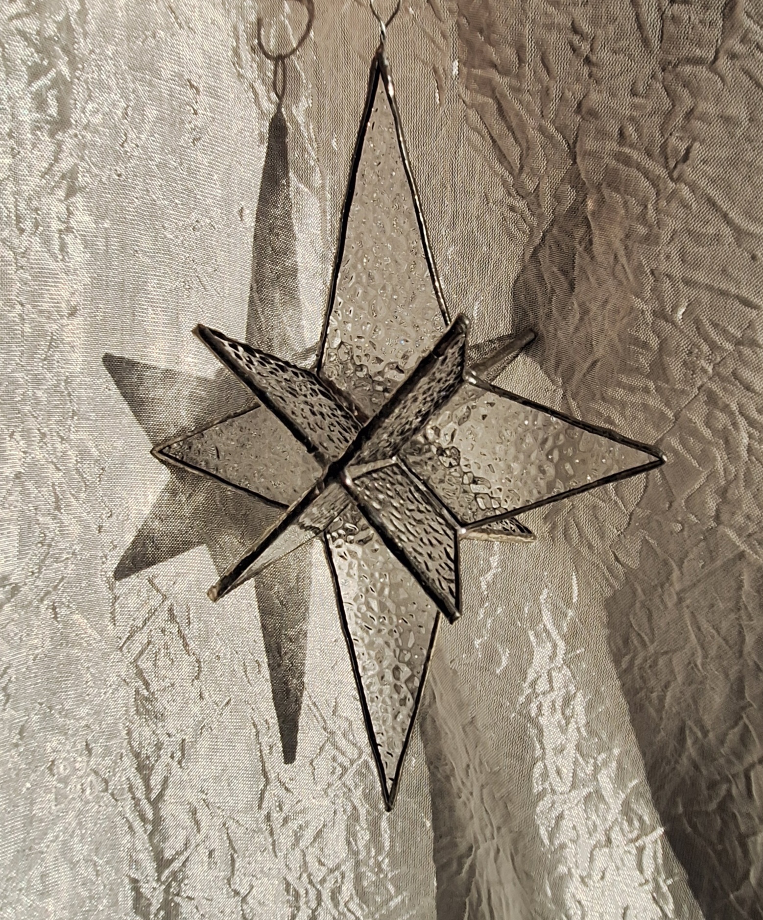 Etoile 3D géométrique, elle est tridimensionnelle cette étoile est faite d’un seul et même verre texturé transparent qui accentue son relief La méthode d’assemblage est la méthode Tiffany Elle est dotée d’un anneau de suspension soudé au sommet