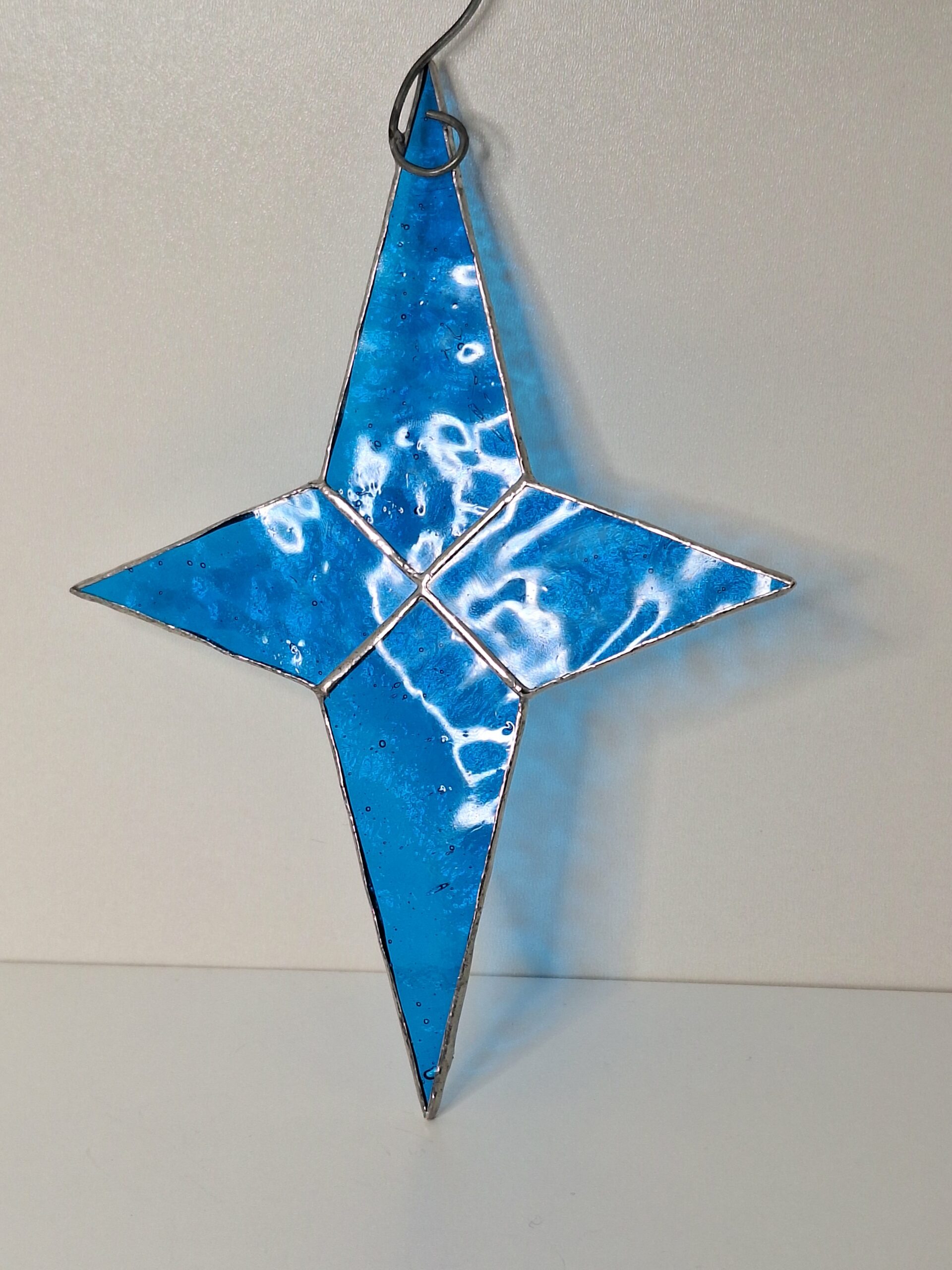 Cette étoile est faite d’un seul et même type de verre , bleu clair transparent avec une face irrégulière La méthode d’assemblage est la méthode Tiffany L’étoile possède une accroche métallique soudée