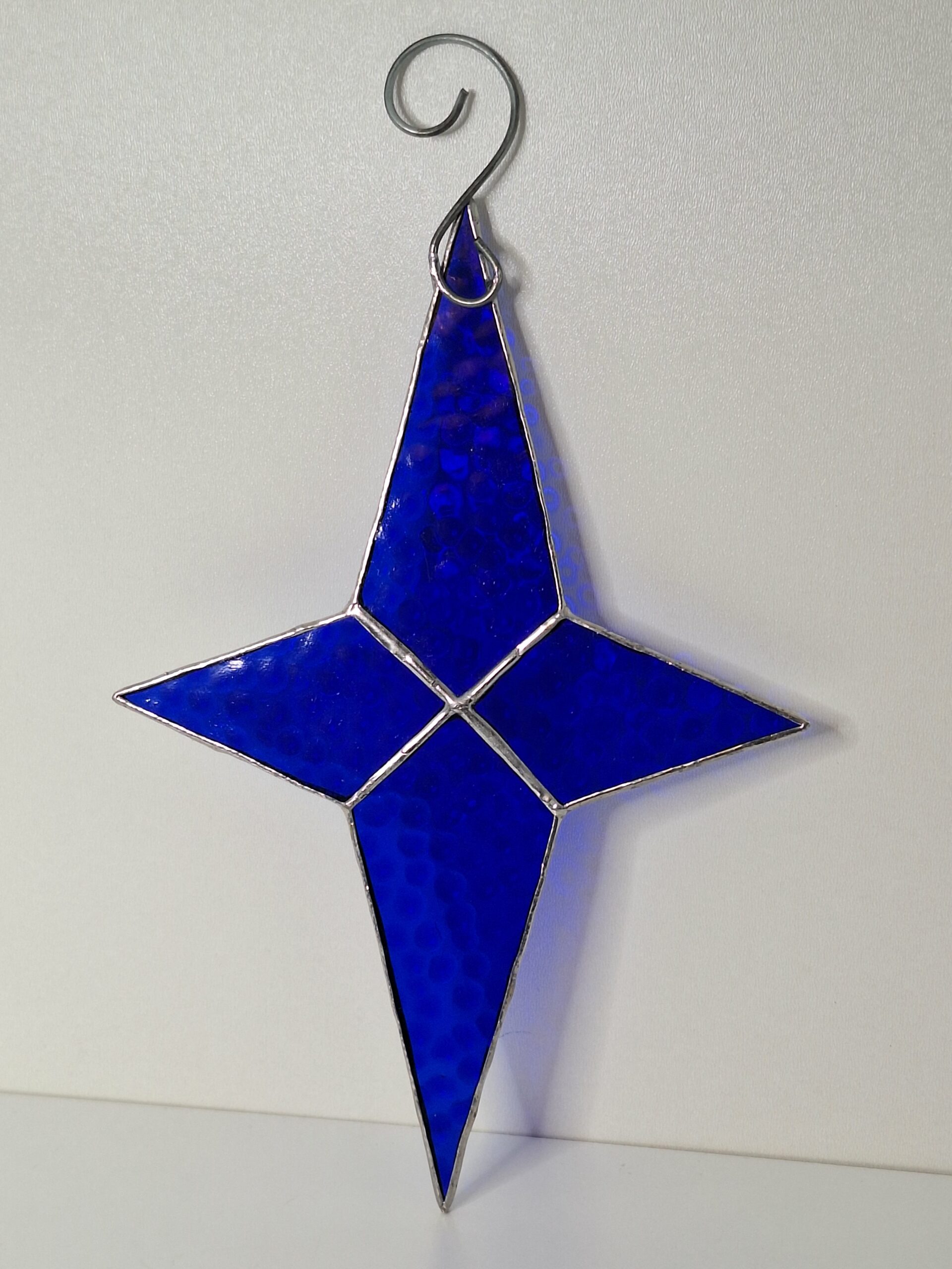 Cette étoile est faite d’un seul est même type de verre bleu foncé , texturé effet goute d’eau La méthode d’assemblage est méthode Tiffany L’étoile possède une accroche métallique soudée