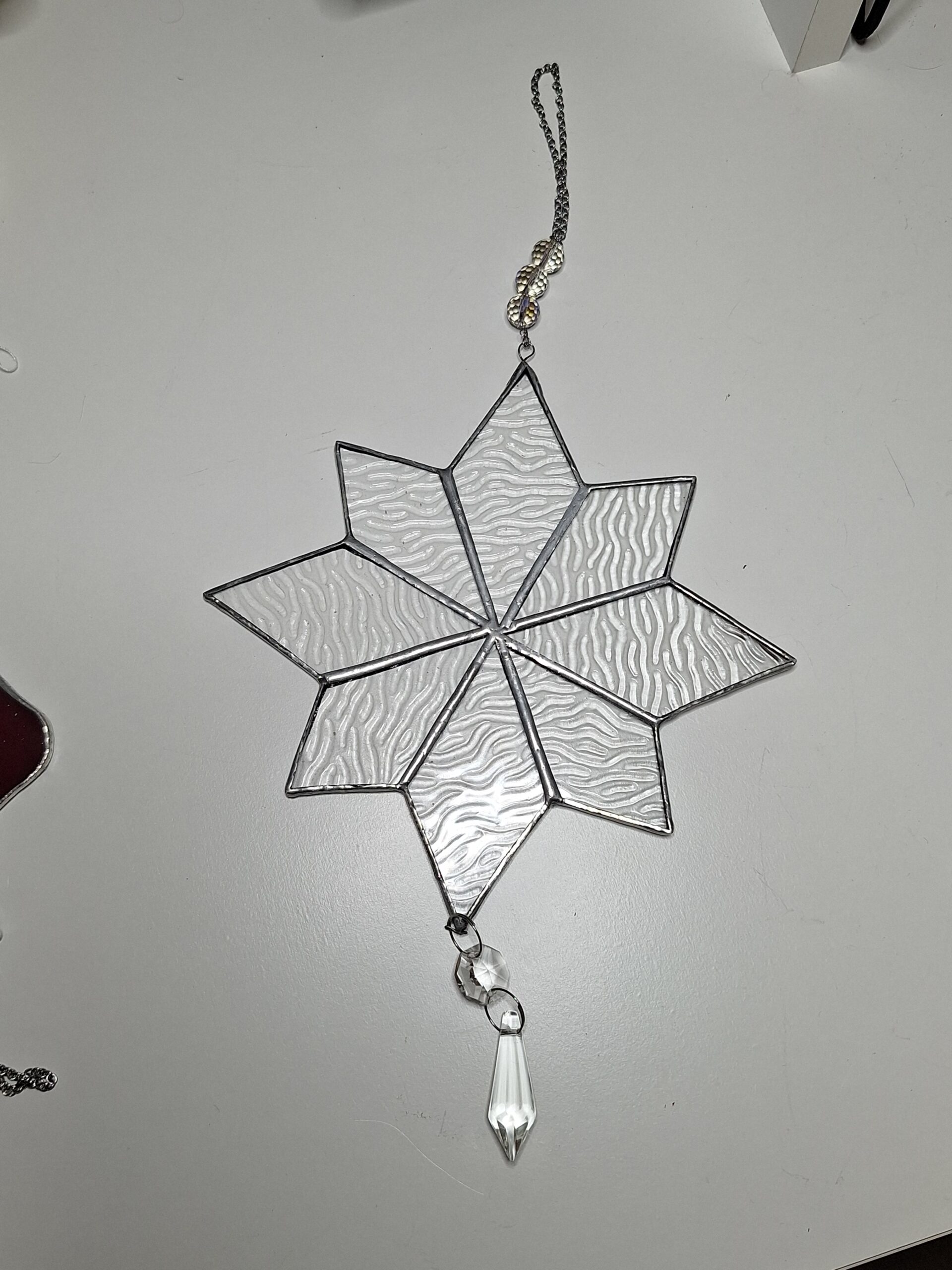 L’ensemble de cette étoile est faite d’un seul et même type de verre texturé effet ondulé Ornée de petites perles nacrées et d’un prisme en forme de goutte d’eau La méthode d’assemblage est la méthode Tiffany