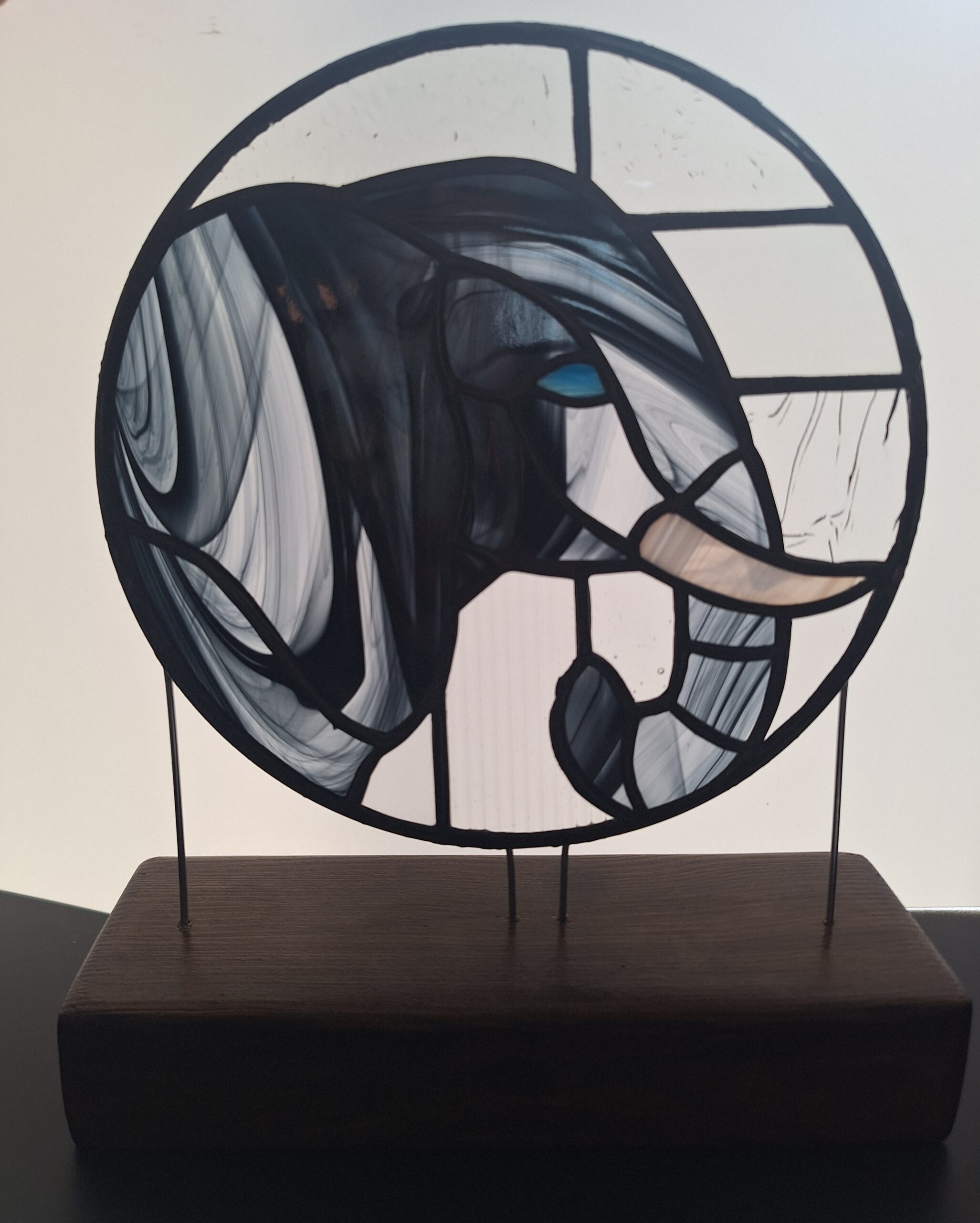 Cette pièce unique en vitrail artisanal représente un profil d’éléphant stylisé, capturé dans un médaillon circulaire. Ce vitrail joue sur les contrastes de textures. La méthode d’assemblage est la méthode Tiffany.