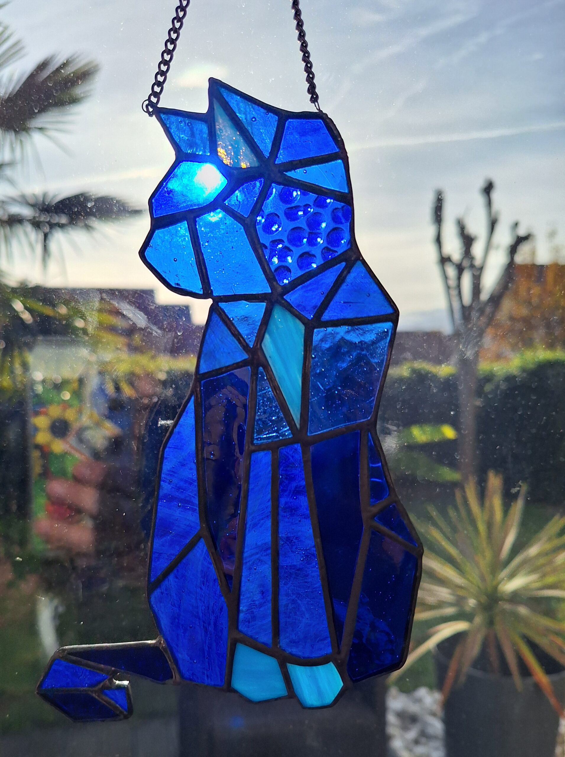 Shard est un vitrai moderne réalisé par le sertissage géométrique de verre bleu cobalt. Il capture la quiétude mystérieuse d’une silhouette féline Composé de différents verres , la technique d’assemblage est la technique dit Tiffany